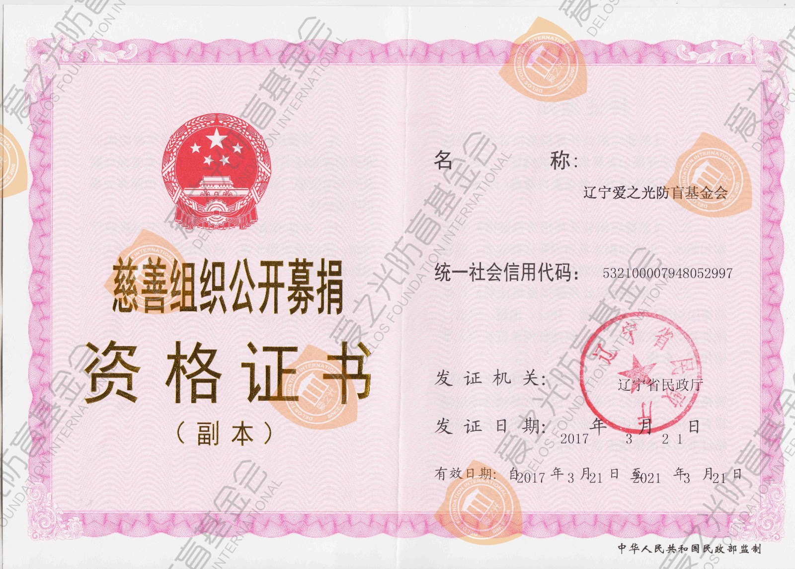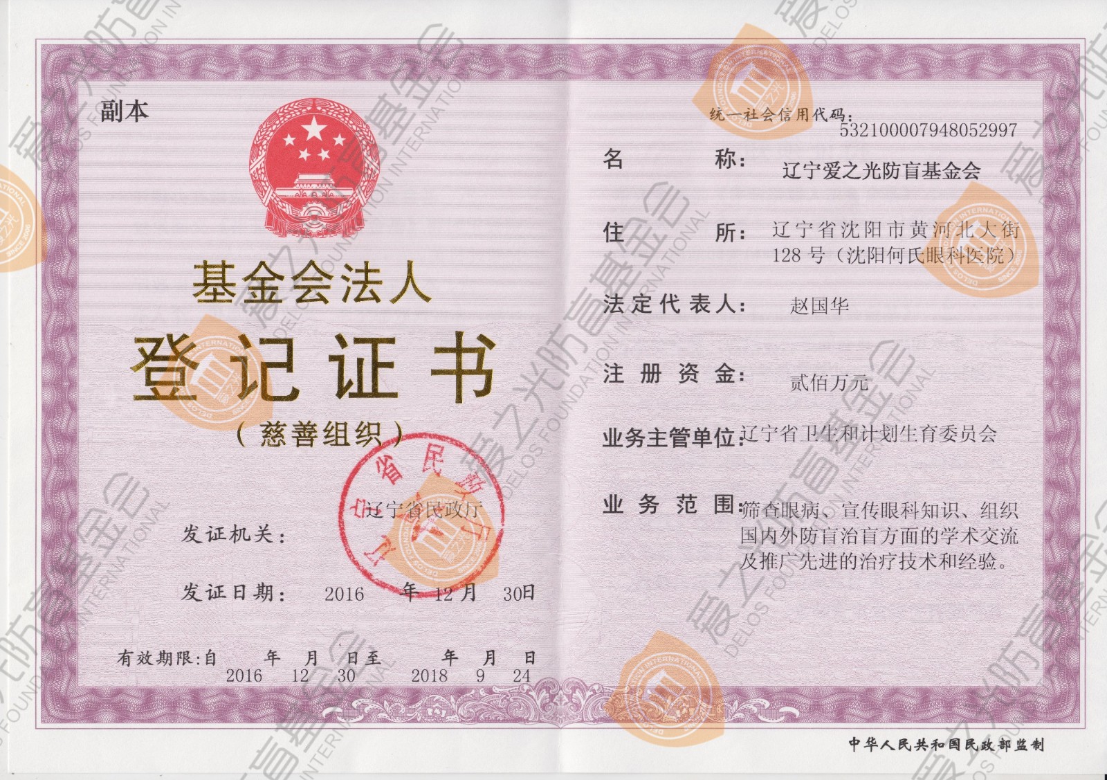 2016年12月30日——爱之光防盲基金会成为辽宁省首家被官方认定的慈善组织