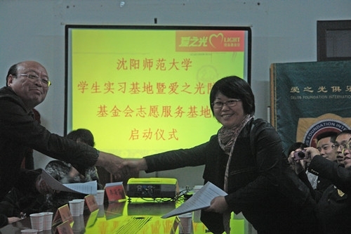 2011年12月9日,沈阳师范大学学生专业实习基地暨爱之光防盲基金会志愿服务基地正式启动,沈阳师范大学教务处、研究生处、社会学学院与爱之光防盲基金会签署了共同建立“沈阳师范大学学生专业实习基地”的协议。会上爱之光基金会秘书长杨玉柱、沈阳师范大学社会学学院院长刘平教授以及社会学院学生代表做了讲话。这次实习基地的启动为爱之光基金会和沈阳师范大学搭建了一个交流与学习的平台,并将进一步推动双方在社会工作方面的共同发展。
