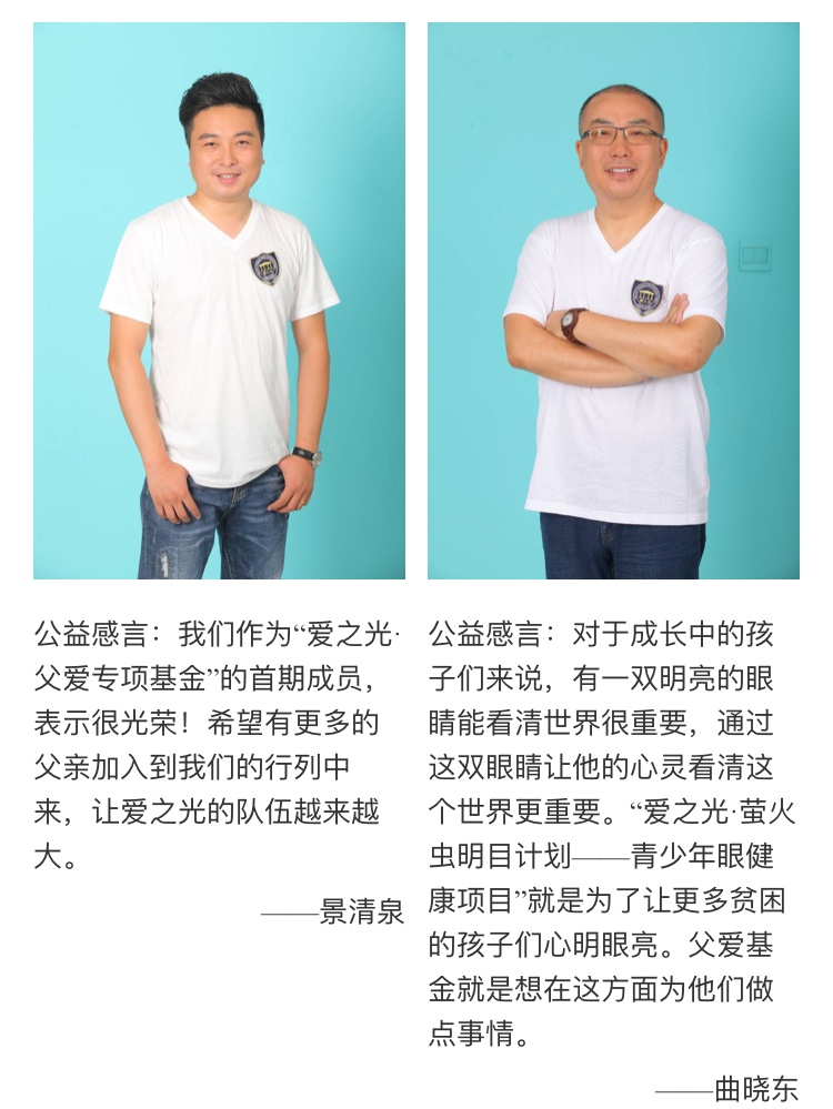 在父亲节来临之际,景清泉先生、曲晓东先生、宋柏臣先生、尚祖安先生、王兴华先生、王燚先生六位父亲每人捐赠2万元善款,共同成立“爱之光·父爱专项基金”,用自己的行动为贫困地区的孩子汇聚爱心,点亮光明。